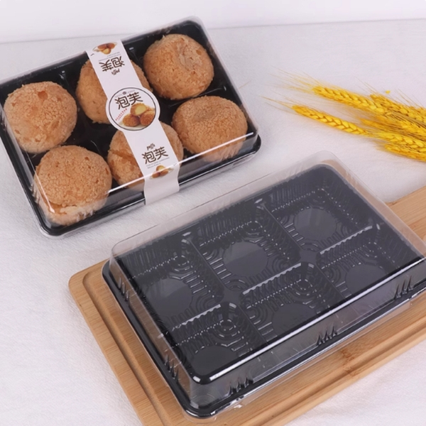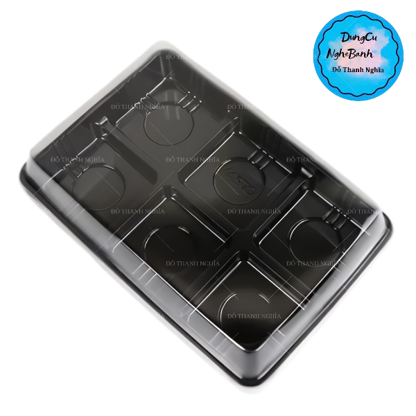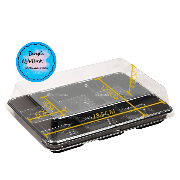 Hộp bánh nhựa 6 ngăn vuông đế đen Kích thước lọt lòng mỗi ngăn đựng bánh: 6 x 6 cm x cao 5 cm Chất liệu: Nhựa, đế màu đen, nắp nhựa trong Sử dụng: đựng bánh trung thu, rau câu, cupcake, socola...... bánh trung thu 50-75gr bánh tho to 7.5cm